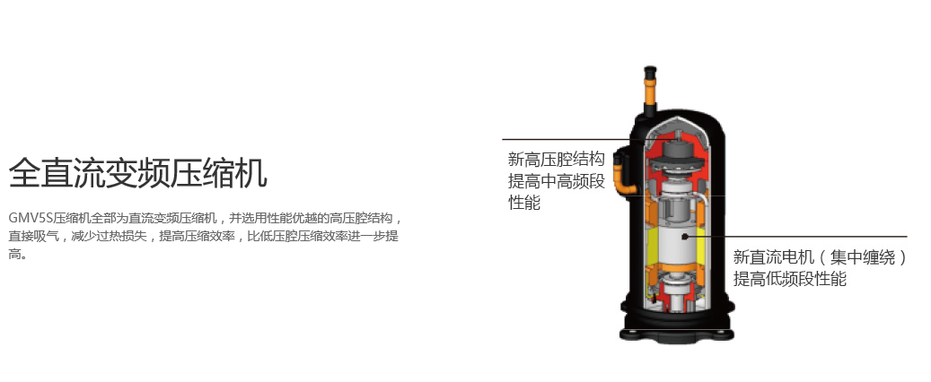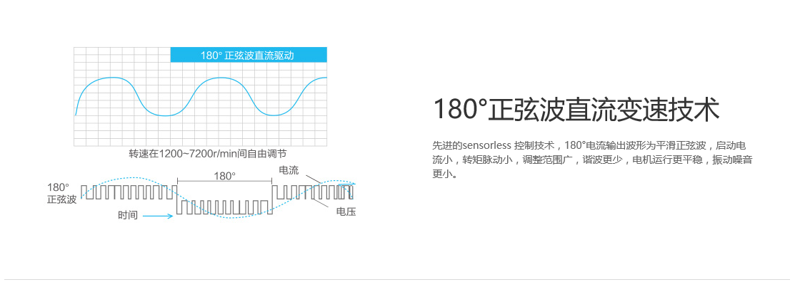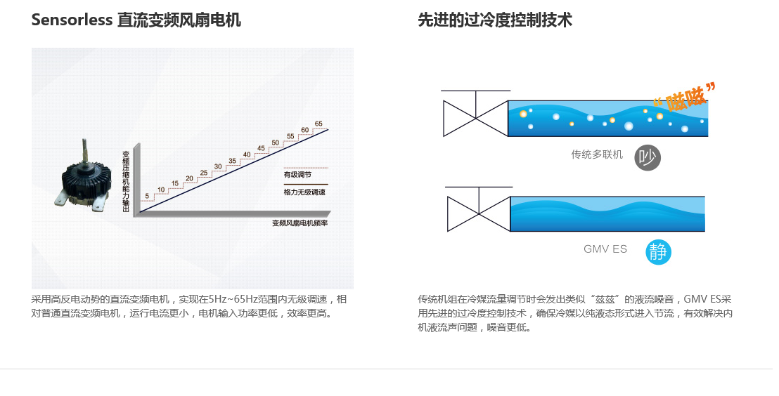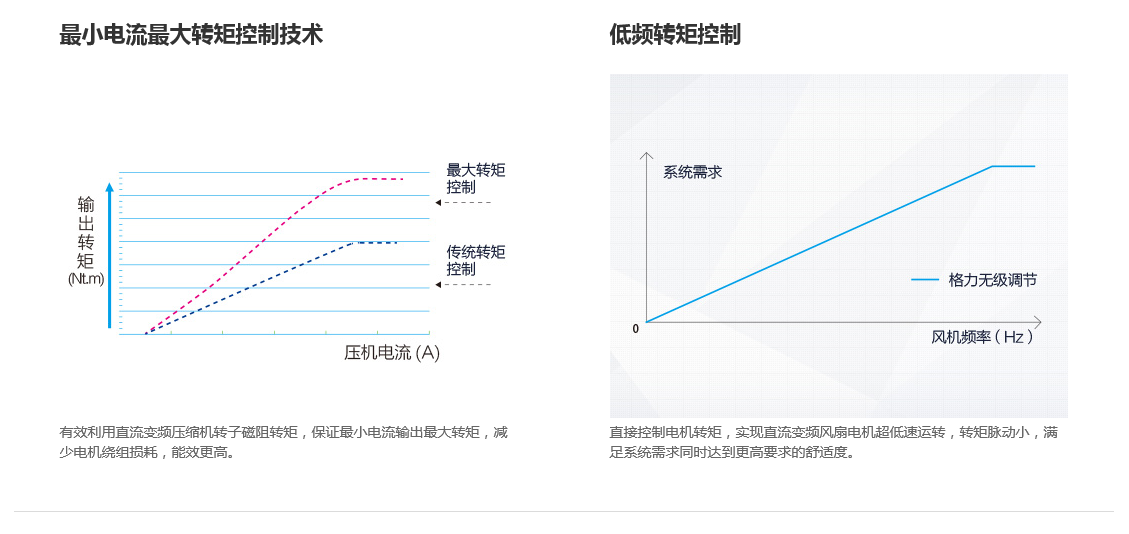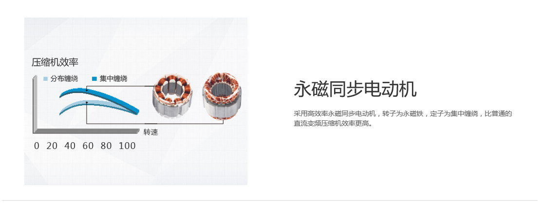 全直流變頻技術(shù)、永磁同步電機(jī)、直流變頻壓縮機(jī)、過(guò)冷度控制技術(shù)、180°正弦波直流變頻技術(shù)、雙節(jié)能運(yùn)行模式、制熱不換向回油
